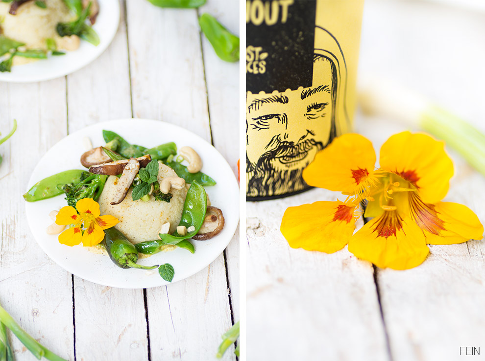 Für alle anderen gibt es wie angekündigt Gemüse mit Couscous. Das ganze wird serviert auf einer Cashewsahne in der das zweite Gewürz des Tages seinen Einsatz findet. Ich habe euch ja schon öfter erzählt, dass Herr Fein bei uns eigentlich der Chefkoch ist und so durfte er auch das herzhafte Gewürz aussuchen. Ich muss sagen, seine Wahl war wirklich sehr gut. Außer diesem Gericht haben wir schon sehr vieles mit “Ras El Hanout” gewürzt und sind beide total begeistert. Ich muss vielleicht noch kurz erzählen, dass Herr Fein Gewürzmischungen im allgemeinen nicht so toll findet, da er gerne selbst bestimmen möchte welche Gewürze und wie viel davon in seinen Gerichten landen. Umso größer ist also das Lob an Just Spices für diese feine Gewürzmischung, denn auch Herr Fein verwendet sie sehr oft und ist überrascht von den vielfältigen Einsatzmöglichkeiten.